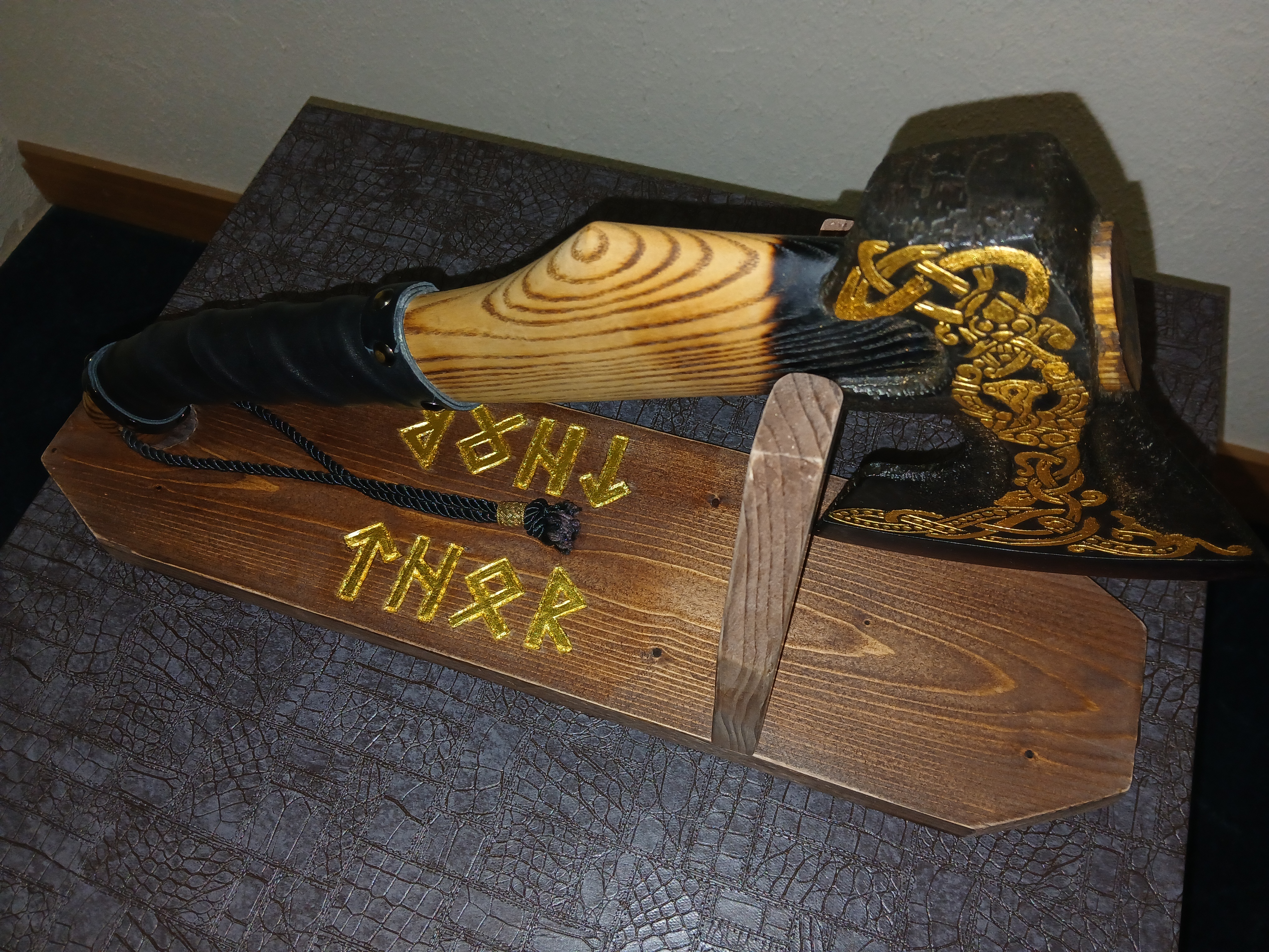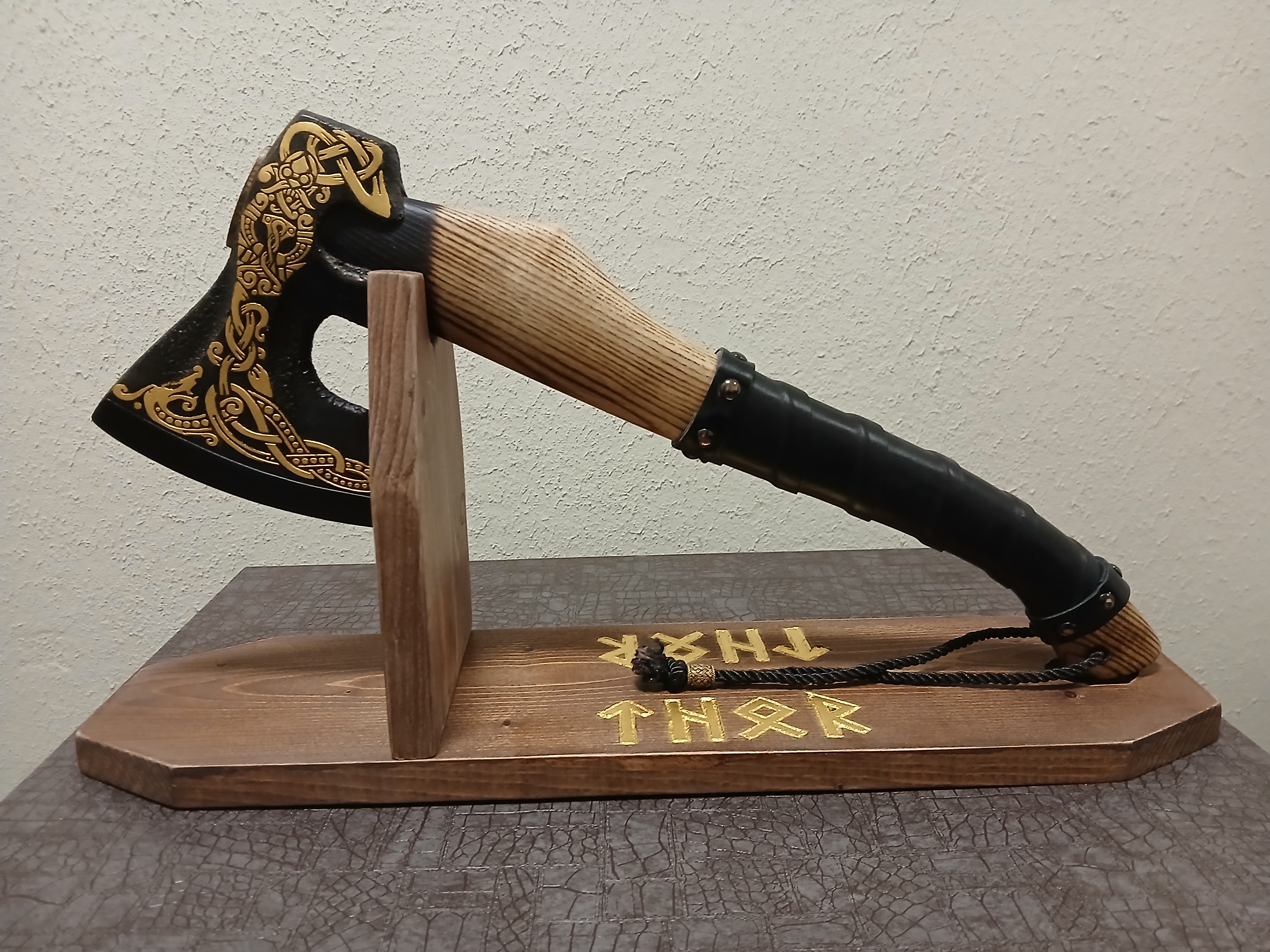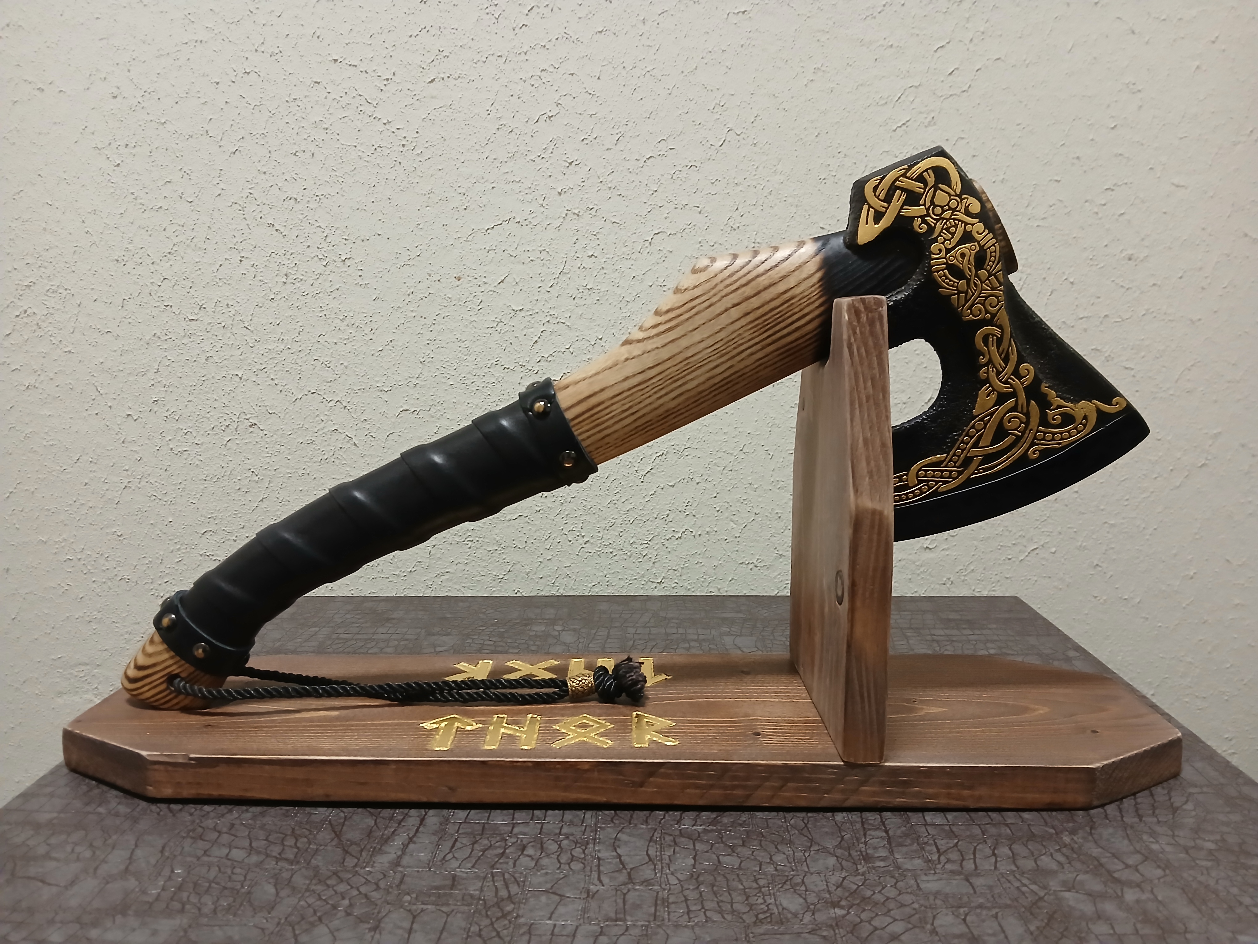Позолоченный сусальным золотом(23к) топор "Тор"(лезвие 15см, длина топора 50см) на деревянной подставке, тоже позолоченной.